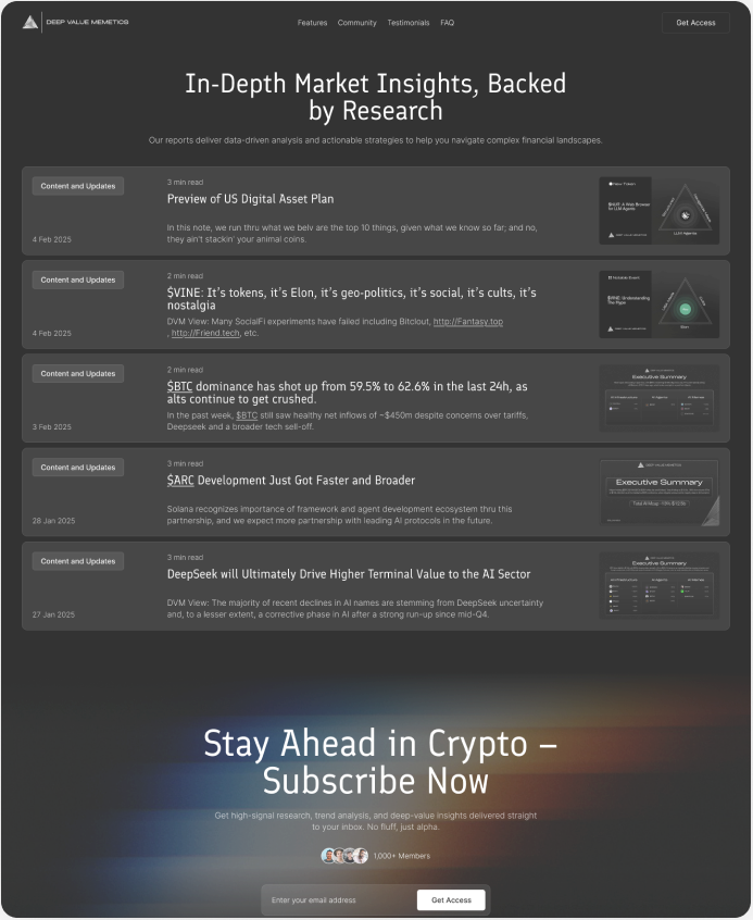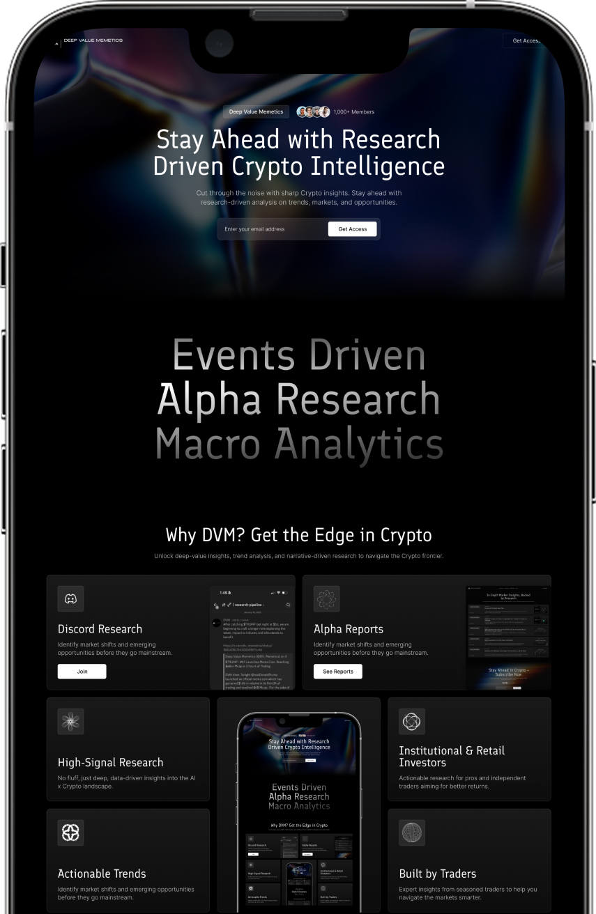 Deep Value Memetics (DVM) is a research-focused platform that provides in-depth analysis on the intersection of AI and cryptocurrency. We offer insights through online publications, email newsletters, and social media channels.
